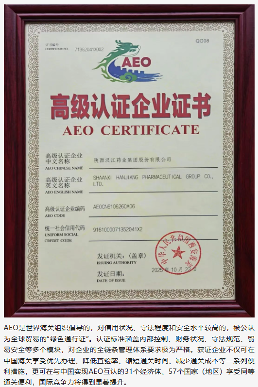西安海关党委委员、副关长吴伟栋代表海关系统,向汉江药业成功获得 AEO 高级认证表示祝贺。他指出,AEO 高级认证是中国海关授予进出口企业的最高信用等级,是全球贸易公认的 “绿色通行证”,其严苛的认证标准涵盖内部控制、财务状况、守法规范、贸易安全等多个核心模块,汉江药业的成功获批,充分彰显了企业在合规管理、全球运营等方面的过硬实力。西安海关将持续秉持 “精准服务、高效监管” 的理念,为认证企业提供更多便利支持,助力企业在国际市场上大展拳脚。
